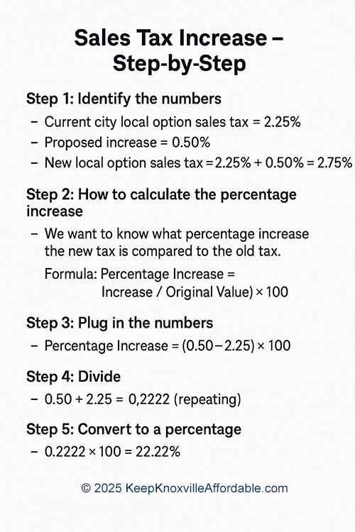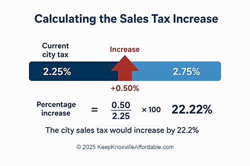 The City refers to it as a “½ cent increase” because the rate rises by 0.5 cents on each taxable dollar (from 2.25¢ to 2.75¢). However, that language can be misleading. In reality, this is a 22.22% increase in the local option sales tax. Don’t be tricked, this tax is not just on one item. Add this 22.22% increase to almost every single item you purchase, including medication. To understand the percentage increase in the city’s sales tax rate:
